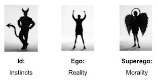 According to Sigmund Freud's model of the psyche, the id is the primitive and instinctual part of the mind that contains sexual and aggressive drives and hidden memories, the super-ego operates as a moral conscience, and the ego is the realistic part that mediates between the desires of the id and the super-ego. It's the angel on one shoulder urging good thoughts, words and actions, and a devil on the other shoulder urging just the opposite. We are caught between these voices in our own minds and must make our choice. The id is childlike, primitive and selfish, expecting immediate satisfaction of every pleasurable desire. It is fantasy oriented and illogical. Tantrums come from a dissatisfied id. The ego is concerned with devising a realistic strategy to obtain pleasure, considering realistic plans that won't cause too much social risk. The superego incorporates the values and morals of society which are learned from one's parents and others. The superego consists of two systems: The conscience and the ideal self. The conscience can punish the ego through causing feelings of guilt. For example, if the ego gives in to the id's demands, the superego may make the person feel bad through guilt. The ideal self (or ego-ideal) is an imaginary picture of how you ought to be, and represents career aspirations, how to treat other people, and how to behave as a member of society. (see https://www.simplypsychology.org/psyche.html)